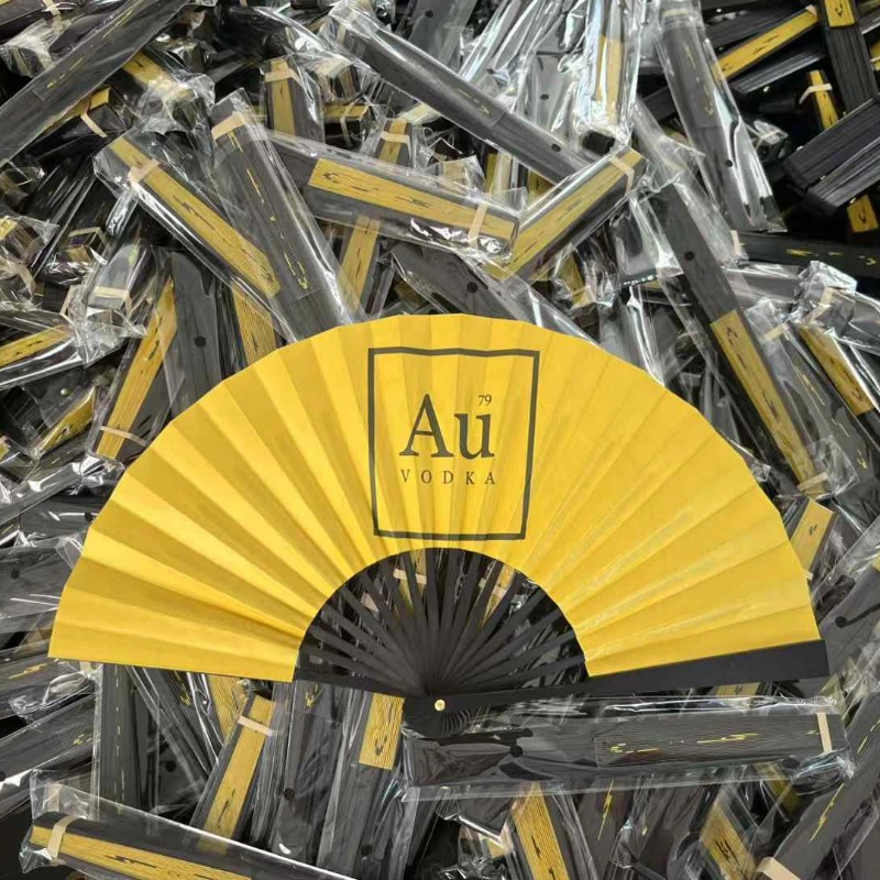 Handfächer mit schwarzen Holzstäben und individuellem Logo